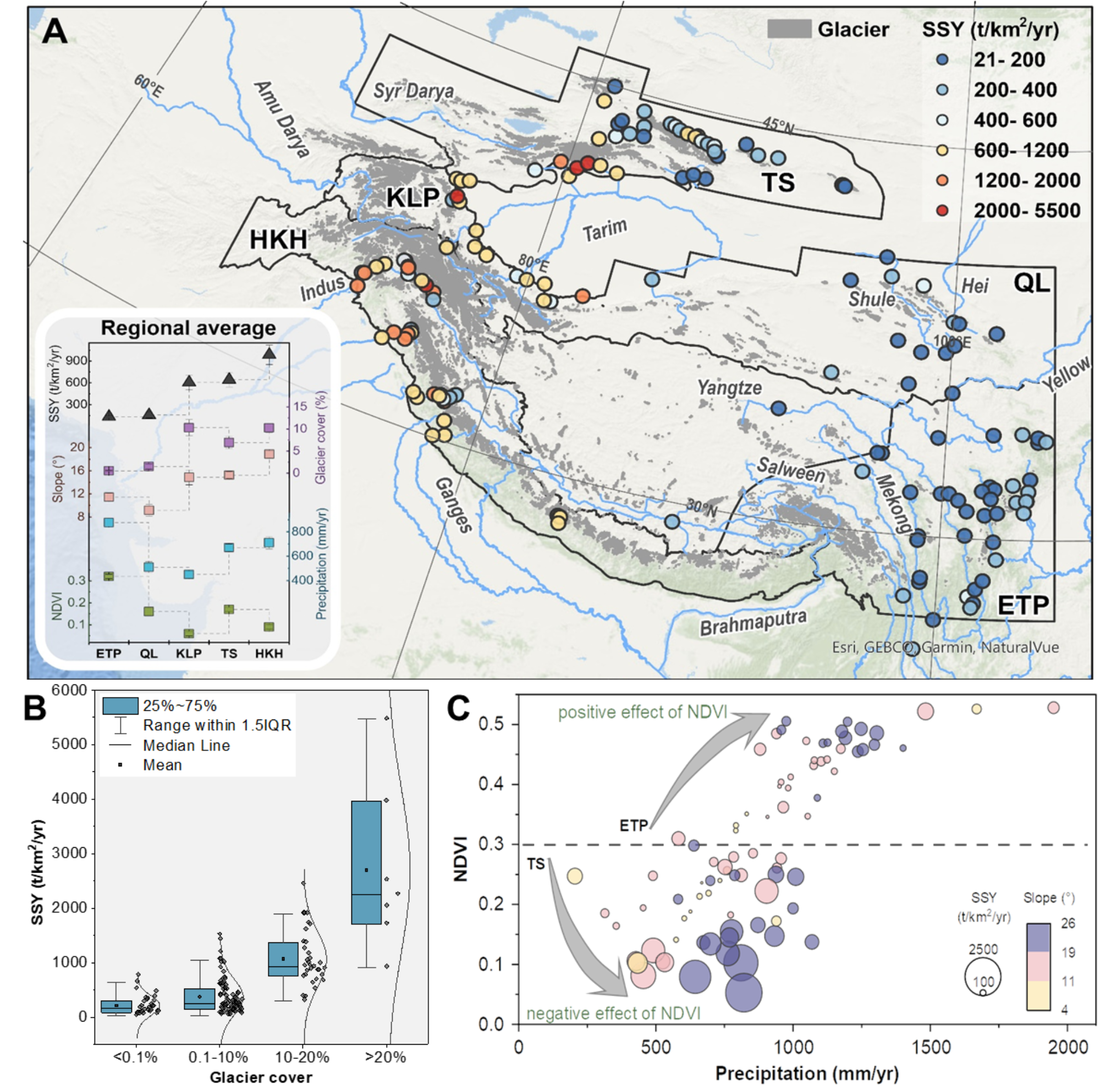研究冰川、气候、植被对高山地区侵蚀和河流产沙模式的作用机制对深入理解区域地貌演化、生物多样性保护及水-能源-粮食系统安全至关重要。然而,受限于大范围-高精度的泥沙观测数据的匮乏,加之高山流域复杂的侵蚀输沙过程,目前对冰川、气候、植被影响高山区河流产沙模式的机制认识尚不明确,难以为山区气候变化适应对策的制定以及水利工程高质量开发提供有效的科技支撑。
